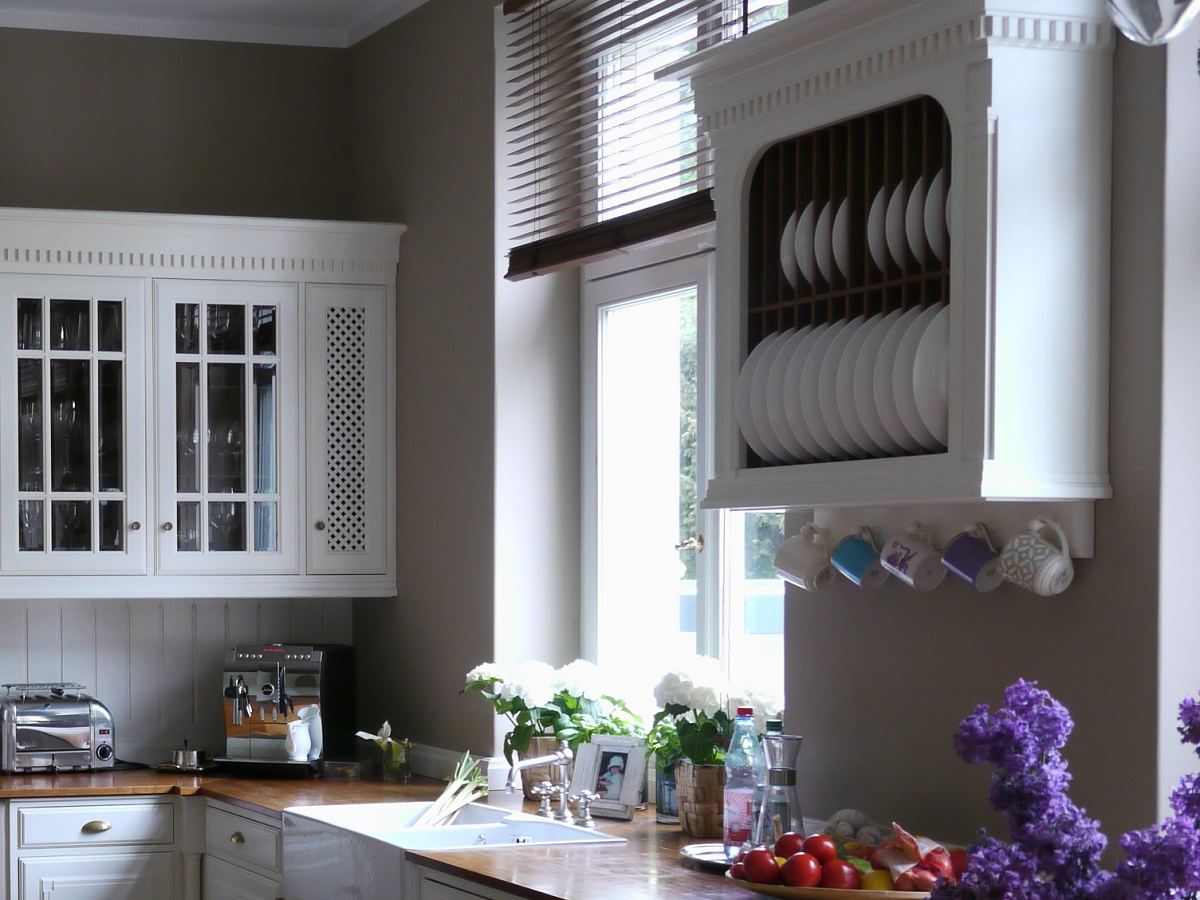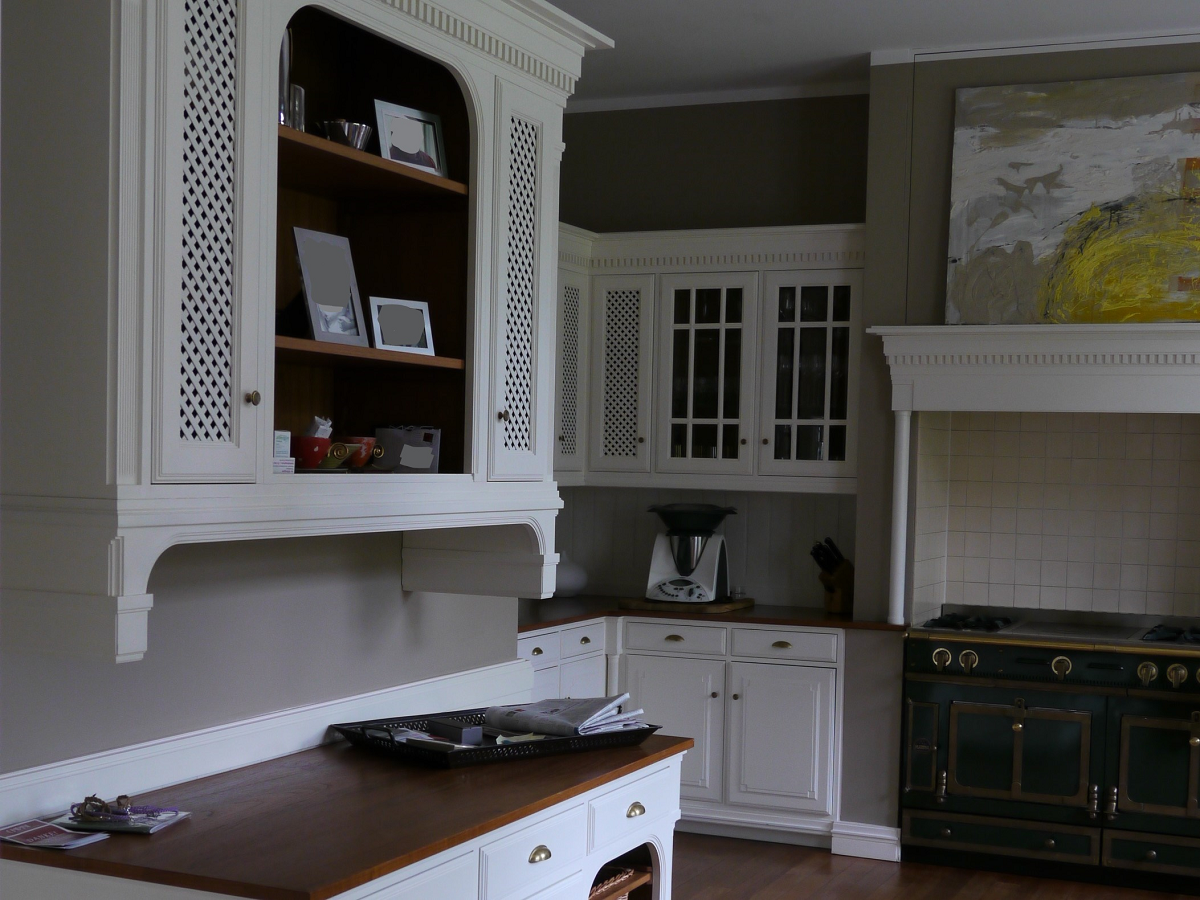 Die weiß lackierten Schränke geben dem ganzen Raum eine helle und freundliche Note. Sie bilden einen guten Kontrast zu dem dunklen Herzstück der Küche. Die feinen, dekorativen Details runden das Gesamtbild ab.