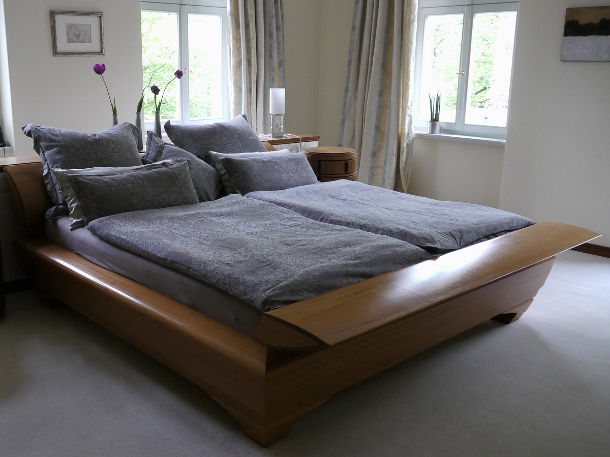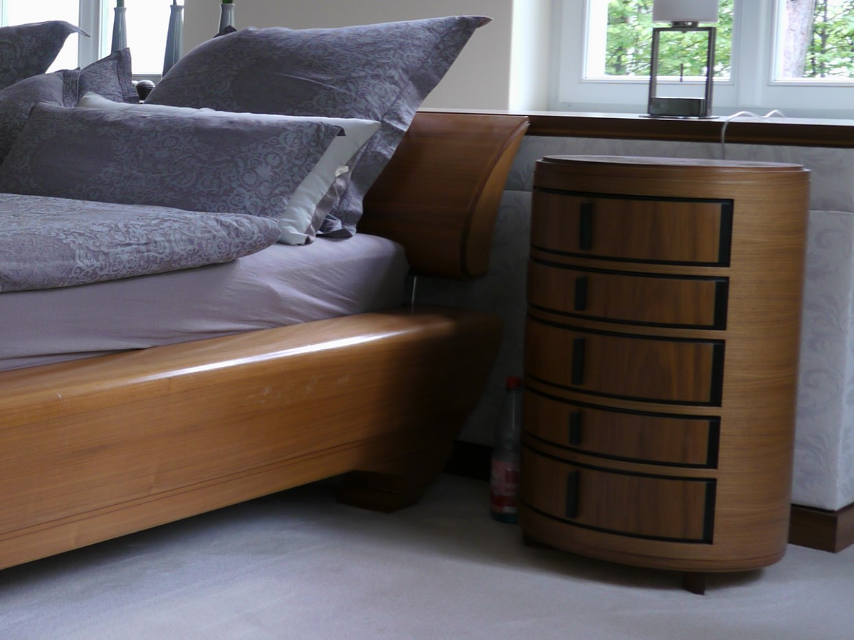 Für das Schlafzimmer entwarfen wir nach Vorgaben des Hausherren ein Bett aus formverleimtem Nussbaum-Sperrholz. Die runden und mit Schubkästen ausgestatteten Nachttische waren eine echte Herausforderung, die wir zur vollsten Zufriedenheit unseres Kunden bewältigen konnten.
