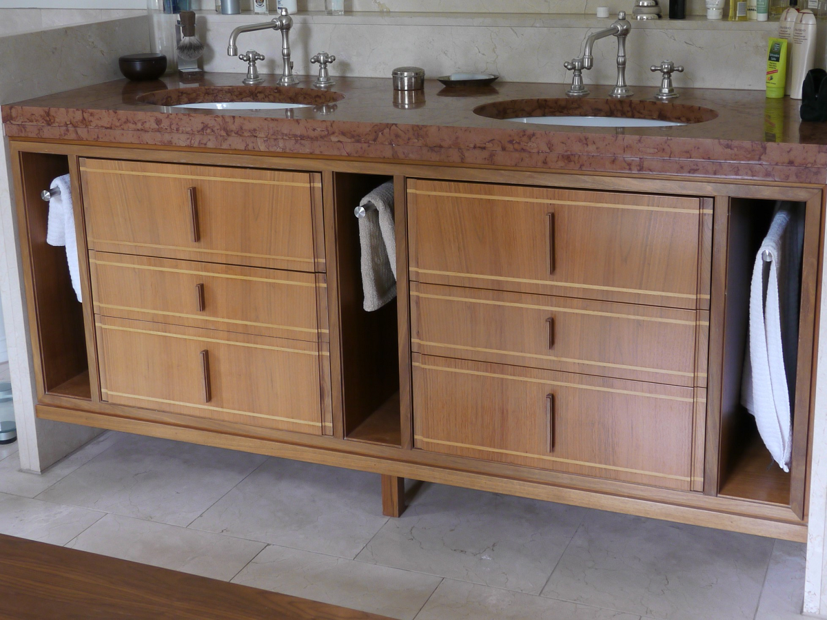 Im Bad entstand ein mit Lisenen verzierter Waschtisch aus Nussbaumfurnier mit Messinggriffen. Lisenen dienen der optischen Gliederung einer Fläche.